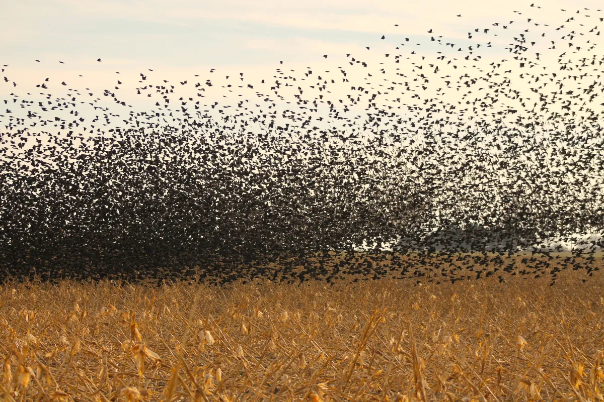 I was driving on the road in Kansas and happened to see a large flock of birds in a field. I ran out into the field and captured them (hundreds of them).