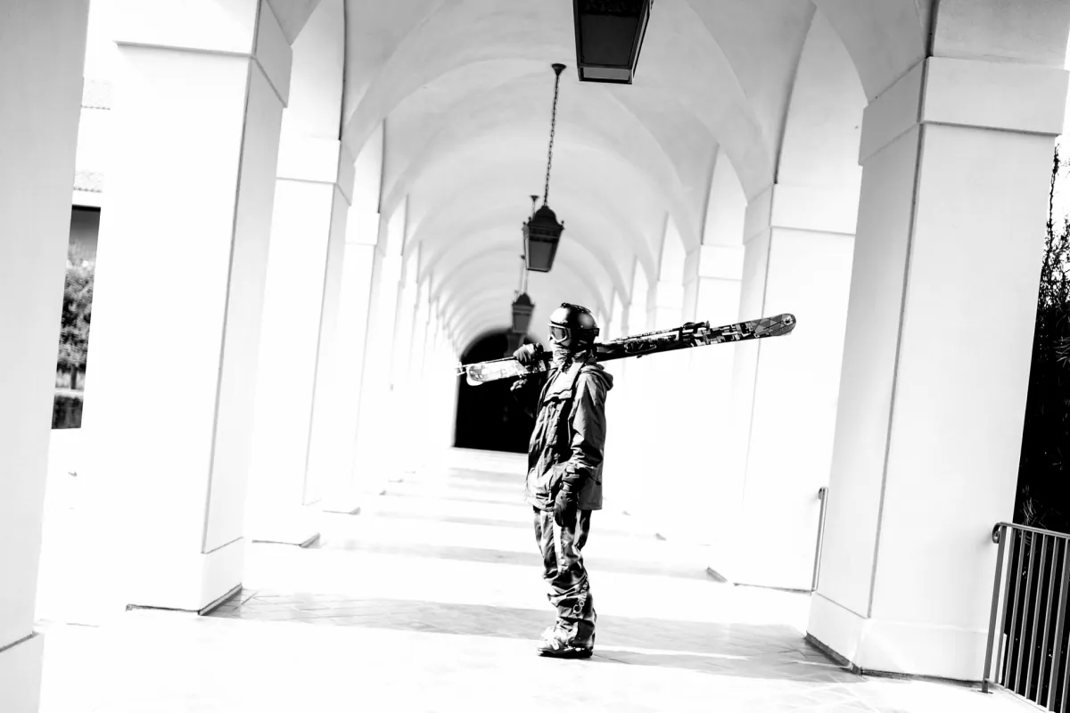 It's difficult being a winter person in a summer world. Taken at the Pasadena City Hall in California. I loved the color contrast of the ski equipment with the Southern California architecture.