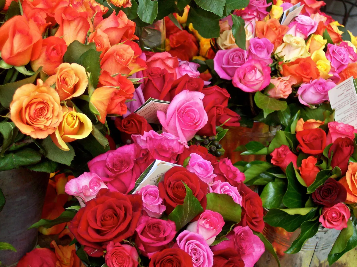 Flowers galore from a Paris flower shop. They were on a stand outside their doorway. What they can do with flowers is always creative and stunning.