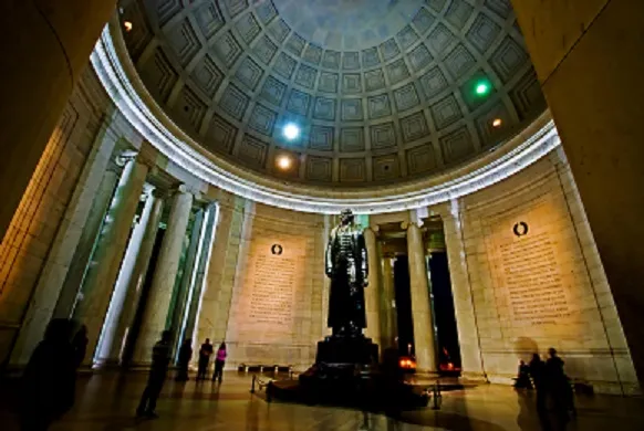 Statue of Thomas Jefferson in the rotunda of the Jefferson Memorial at night.
