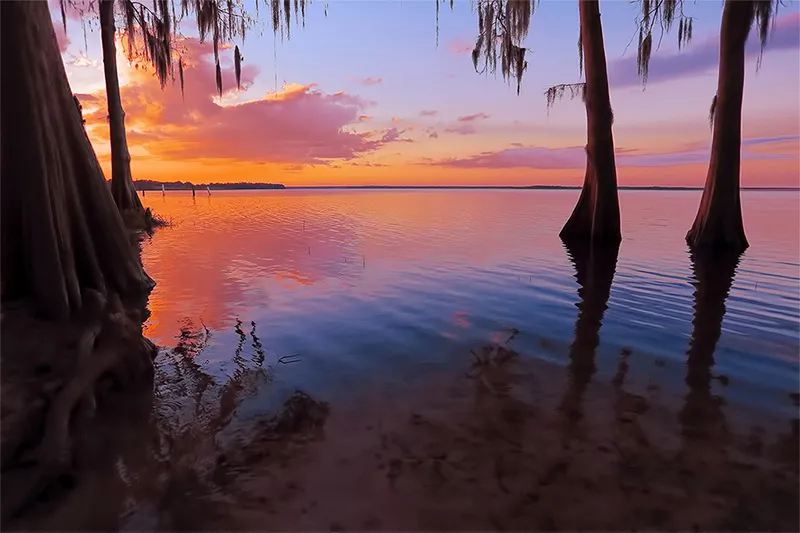 Big cypress trees seen often on the fringe of lakes in the state of Florida are accented by a luminous sunset on Lake Jesup.