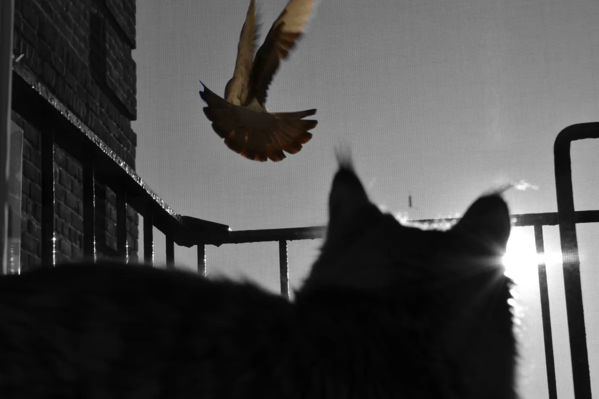 I took this picture while visiting a Hindu temple in Pondicherry, India. I had been photographing two cats wrestling in one of the narrow lanes behind the temple when suddenly one of the cats climbed onto the colourful Gopura and sat completely still with its eyes fixed on me. We must have been observing each other for a good ten minutes and I thought I had got some pretty decent shots. The temple cat, probably bored of me by then, turned its back and crouched, as if about to pounce on an invisible prey. I knew something was going to happen, so I got my camera ready and was rewarded with this spectacular leap of faith!