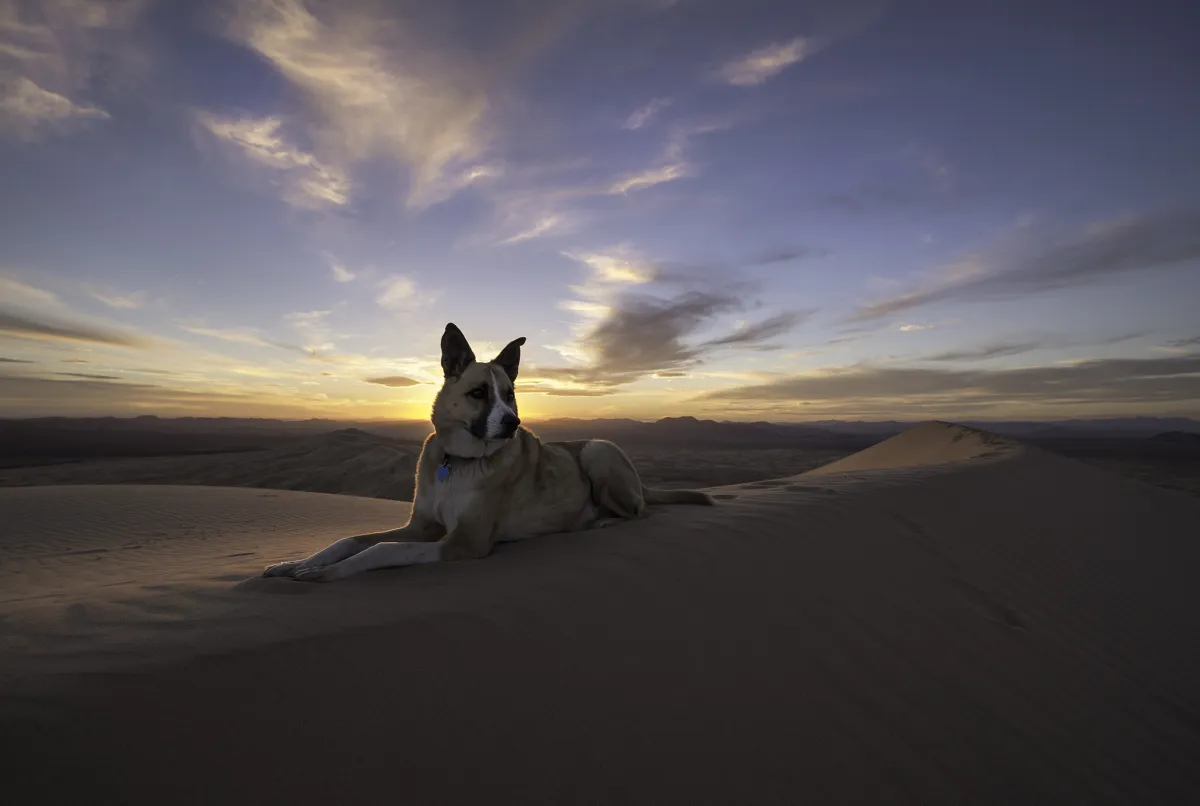 My best friend, photo assignment partner on local road trips. The General or Vito. Never on a plane though. I travel to the desert a lot in California, Arizona and New Mexico with The General in the cooler months. My favorite place to photograph. This was taken at Kelso Dunes. The General rests atop Kelso Dunes in the Mojave Desert. Roughly 1hr 30 min walk through small dunes to the main dune, then another 1hr up the peak - about a 720 foot/219 meters climb to the top. In deep sand. Not bad for a ten year old General. I was snapping photos, turned around, and there he was, regal, king, watching the land below him. So happy. How can you no smile when looking at this photo? As for the photo, no filters are used, minimal raw editing. Nikon 14-24 + Nikon D610