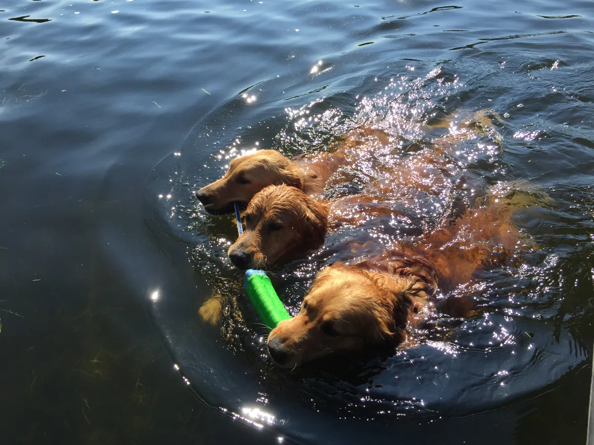 Rupert (top) is owned by my youngest daughter & is from a litter sired by Chase (middle). Chase is owned by my oldest daughter. Gus (bottom) is my second golden. What a great breed! The photo was taken at Buck Lake, Ontario. We have a cottage there. The whole family looks forward to visiting, especially the Golden's. Even though we have a special toy for each Golden, they are somewhat like human children. Everyone wants the same toy. They also share tennis balls & bones.