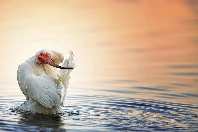 A White Ibis irons out the water in its feathers after taking a bath at the water's edge of Lake Jesup located in Seminole County, Florida.