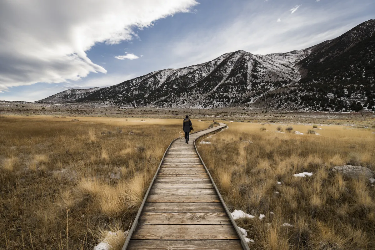 Mono Lake CA. I was focused entirely on something different behind me before I took this photo. Then I turned around. My wife, our dog "The General" (Vito), walking off together in the distance. This great landscape - the Sierras. Three things I care about most are all within this photo