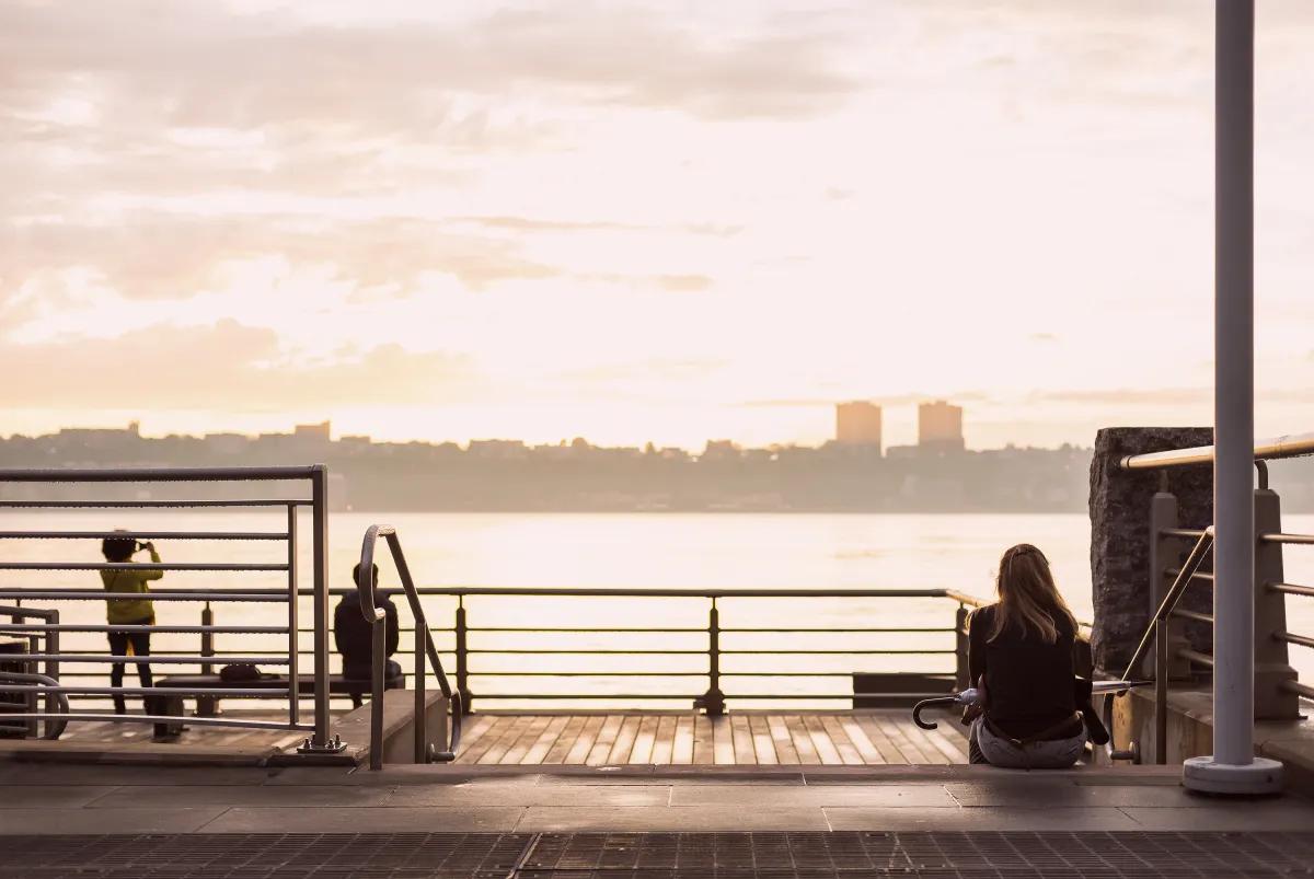 Simple one point perspective. Yesterday afternoon I was exploring NYC. I saw the woman sitting on the stairs enjoying the sunset, then the kid moved in to take a photo and I thought "that might make a good shot" and so I took it. Taken in NYC looking across the water towards NJ, after a dreary and rainy day.