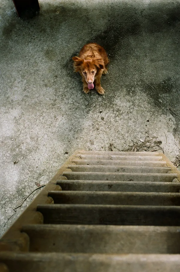 I went for a trip and on the way through the nature I met a wooden view-tower. My best animal friend was following me all the way but when I started to climb the stairs she stopped and sat down realising that it is too steep and high for her to go up. As if she was saying, I can't go further but I will wait for you. Or maybe she was happy she can rest for a while:) I made this picture to remember the precious little moment. And the day I'm submitting this photo is special, it is her 10th birthday:) Strá~ný vrch u Merboltic, Czech Republic Shot on film Kodak Portra 160