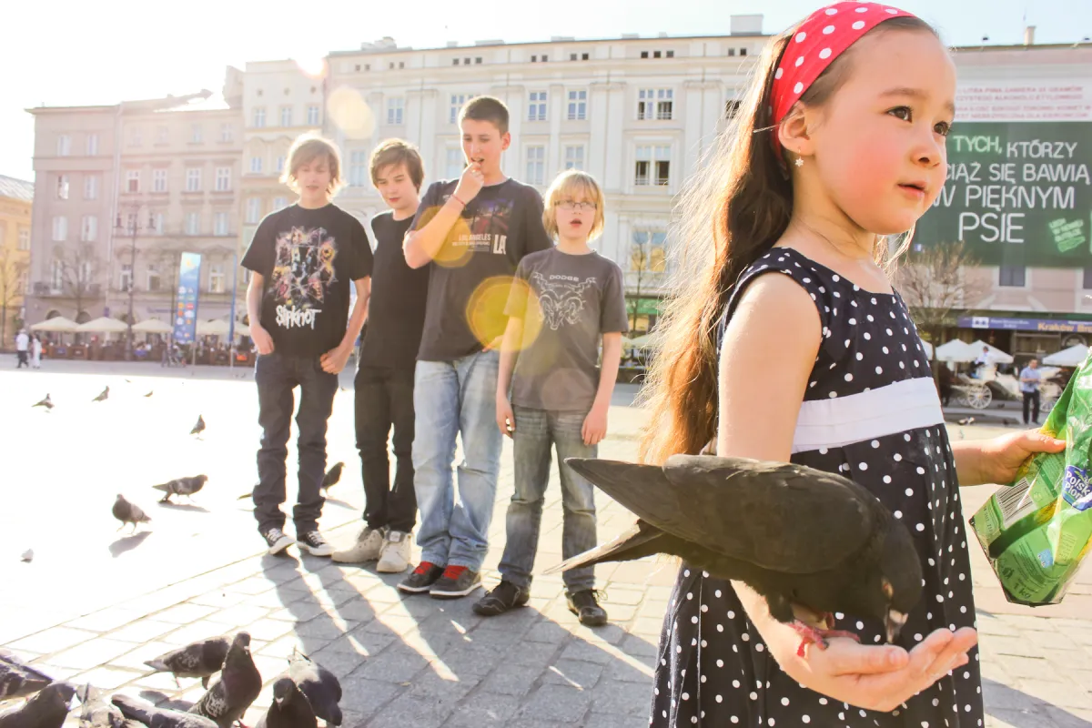 This picture was taken with an photo journalistic approach. The moment could not have been taken at a more perfect time. The sun was just about to set, creating a lens flare that adds ideal geometry. I took this when I went on a trip to Poland to visit my family. This exact location was in the Krakow Main Square. It relates to the theme because a small girl is feeding pigeons while four boys watch.