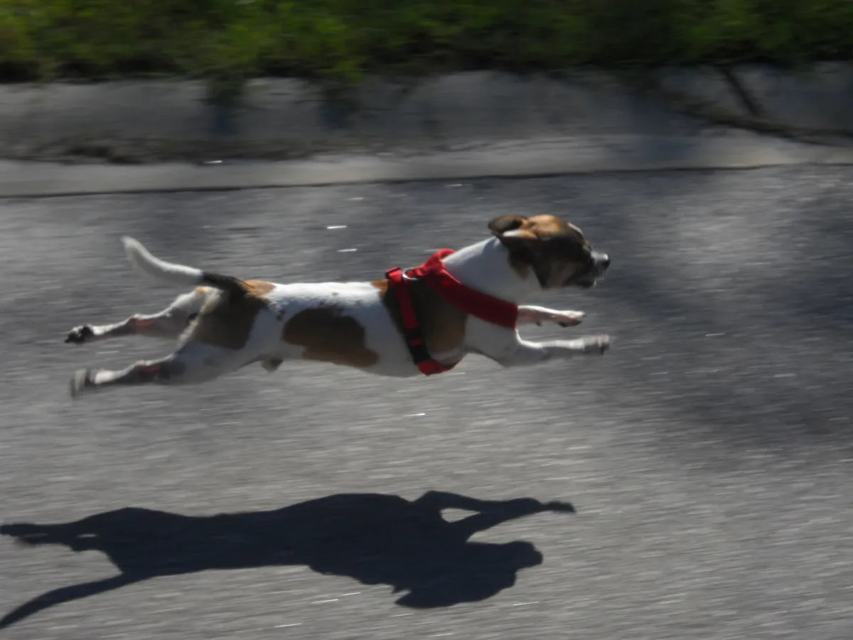 I was riding on a Golf cart beside Spike as he was running down the road trying to race me. I just happen to catch him with all four paws of the ground.
