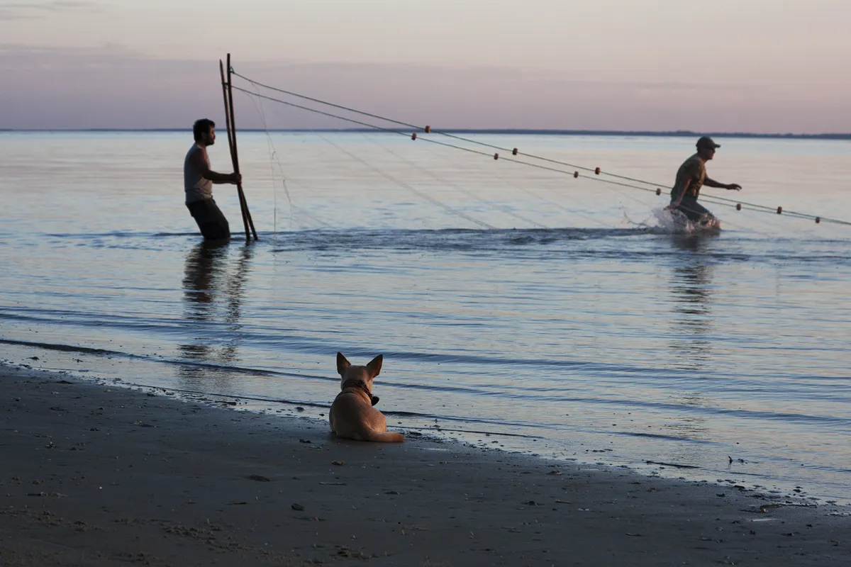 Little dog waits for his masters to finish netting for shrimp as the sun sets in Georgia.
