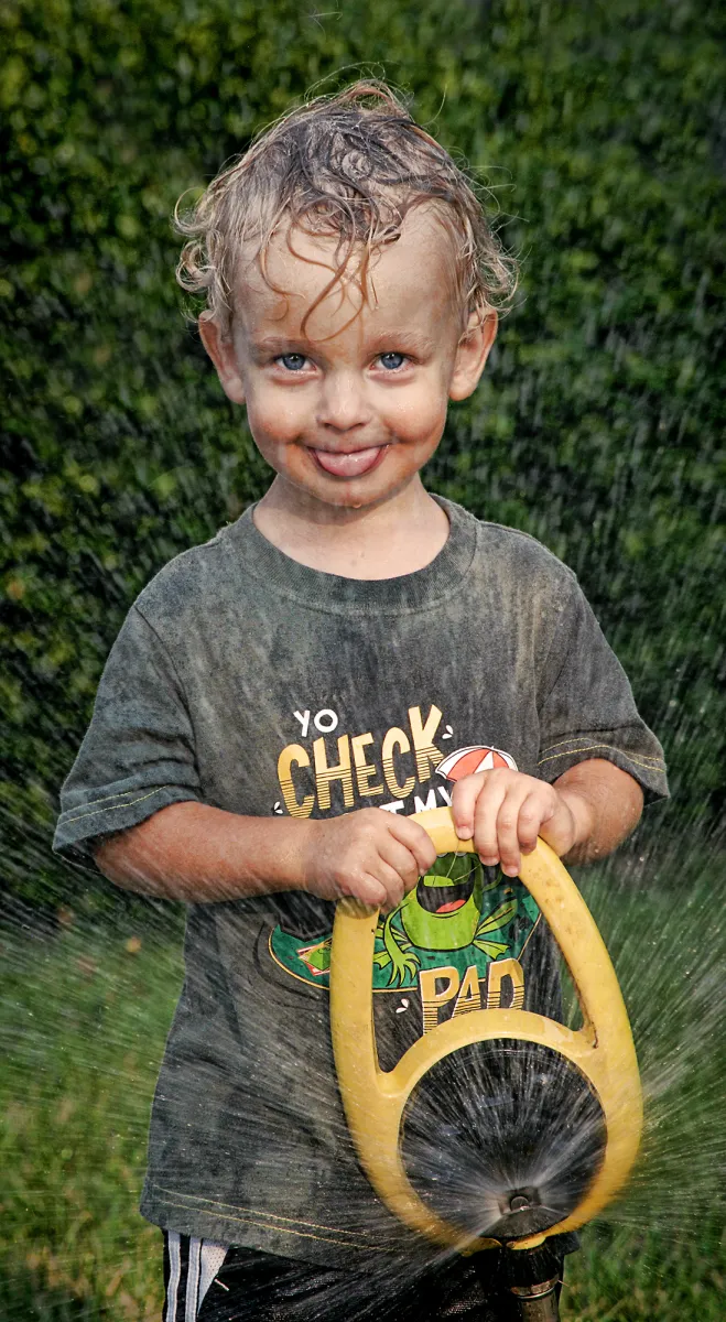 The simplest toy is not the sprinkler, it's the Grandma taking the picture! At least that is what my Grandson seems to be saying to me, while having fun in the water with his two older brothers. I really loved that I was able to capture his humor with the water coming up around his face. Just another fun day in Fort Wayne, Indiana!