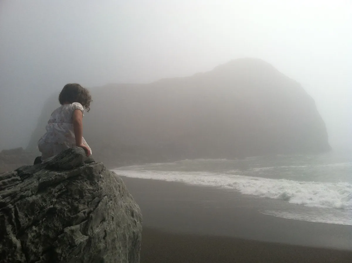This picture captures my 5-year-old daughter's first visit to the ocean on June 27, 2013. She was fascinated by the crashing waves, enormous rocks and immense fog that added to the mystery of the beach. We traveled from Minnesota and visited Duncan's Cove on the Sonoma Coast Beach.