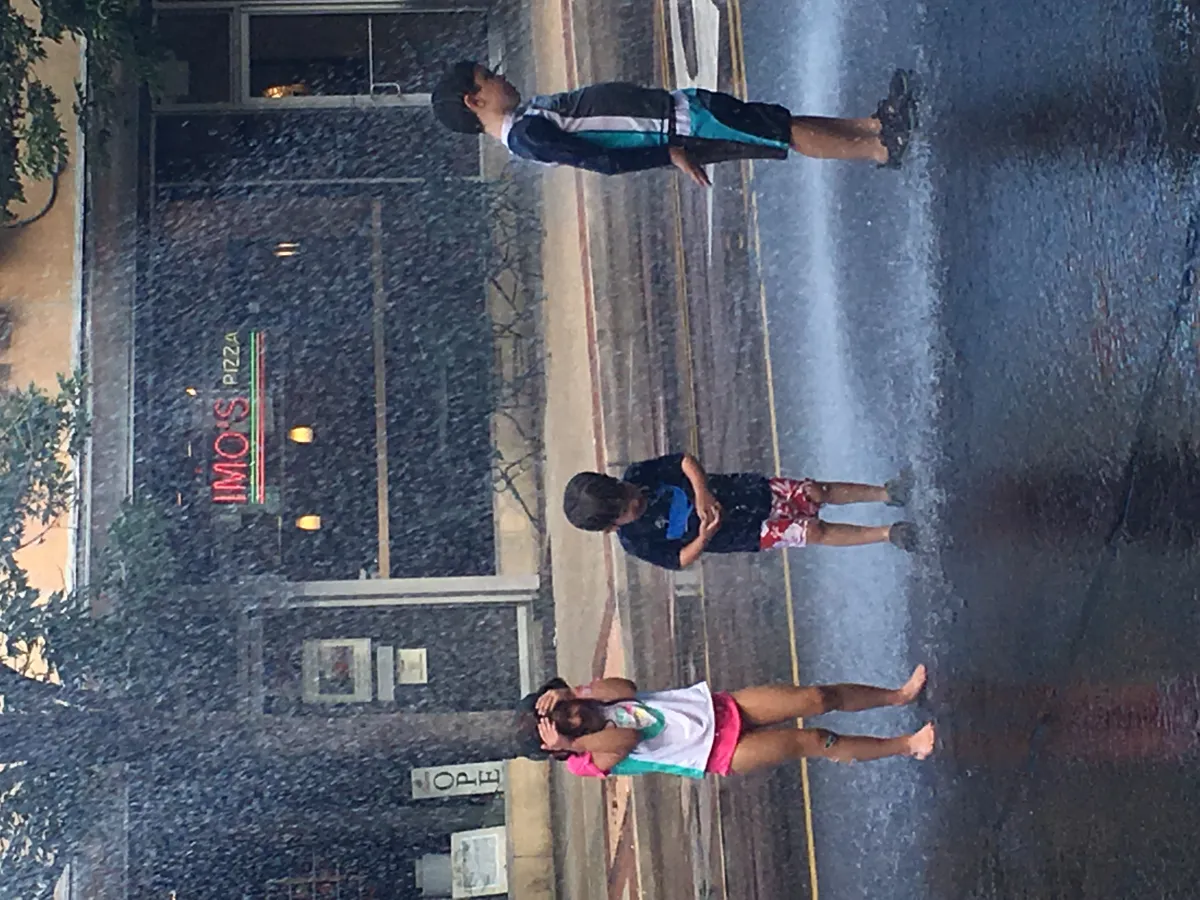 On a hot summer day taking advantage of the hosesbeing tested on the fire trucks.