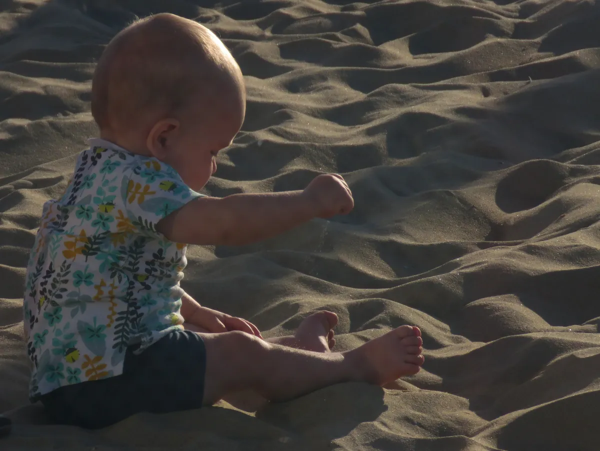 my grandson makes the first acquaintance with sand from the beach