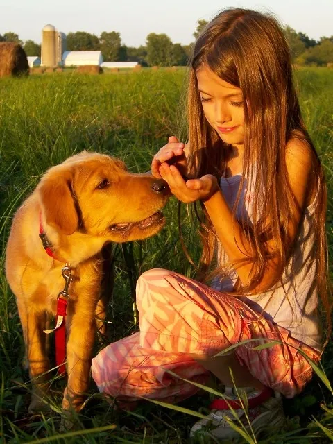 Our pup, trying to get our daughter Kyra's wild blackberries. Taken at sunset in our Ohio hayfields, August 2006.