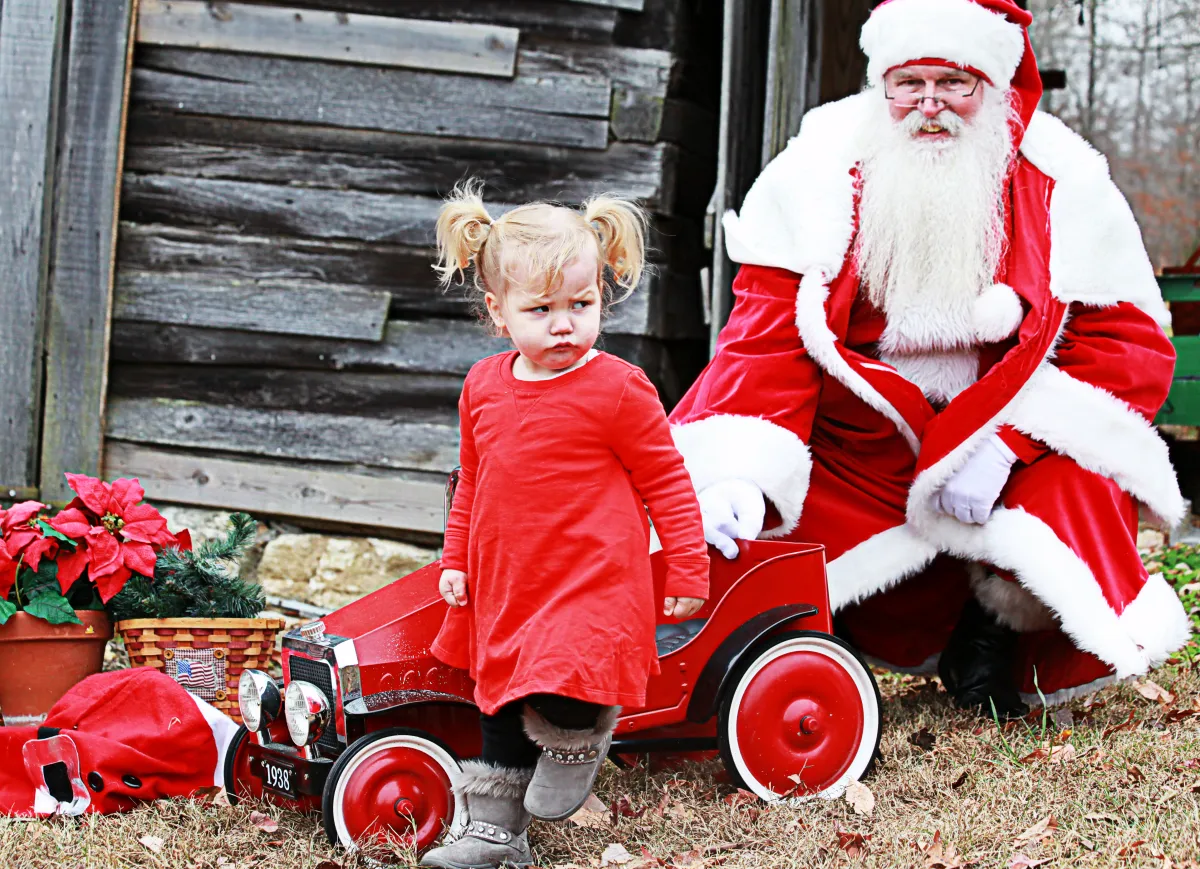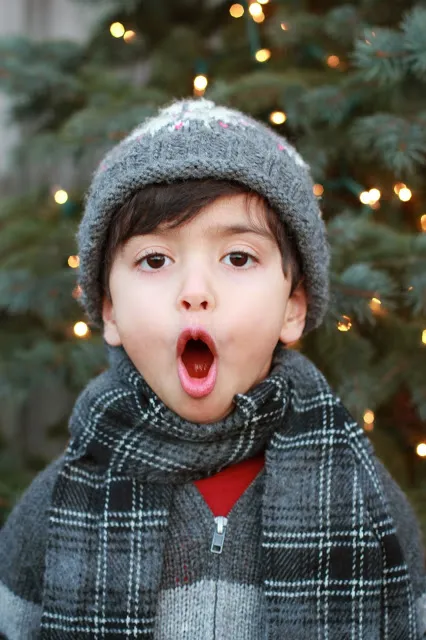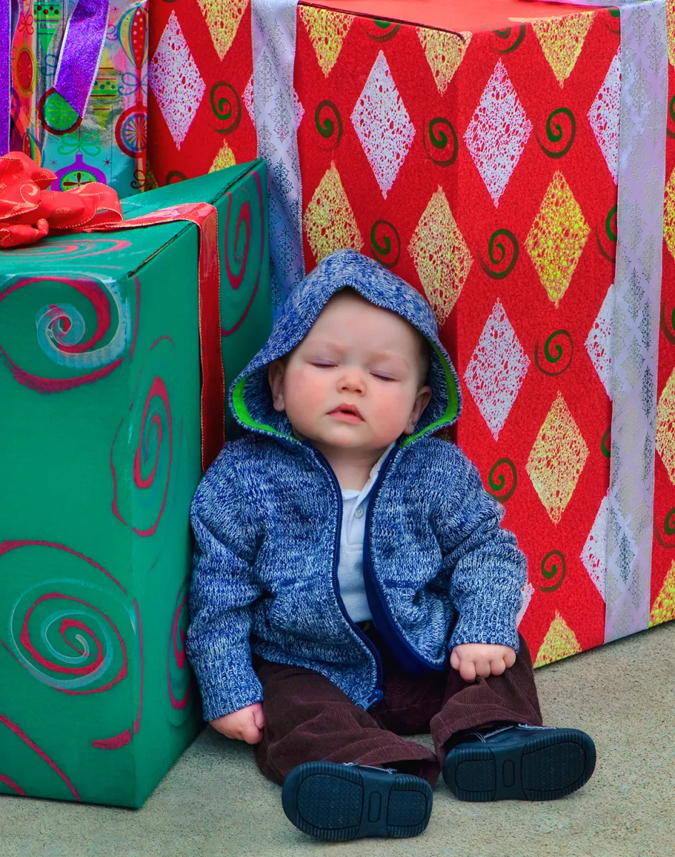 I was at an outdoor Christmas festival when a mom put her child down next to a Christmas tree exhibit to take his picture. I don't think she realized he was still sleeping. Behind her I snapped this shot right before he awoke. It was all sugar plums!