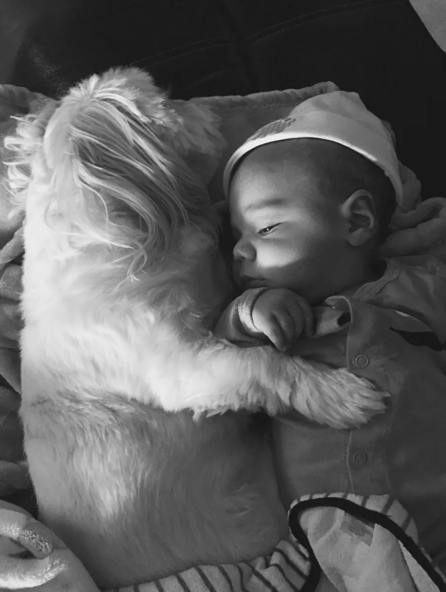 my puppy Rusty decided he was gonna sleep next to me 2 month grandson AJ.