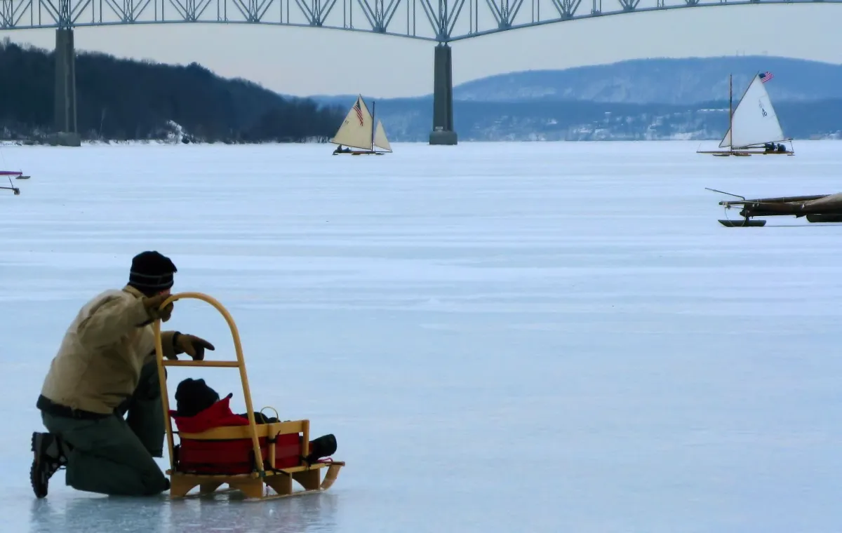 This was taken on the Hudson River near Barrytown, NY during this unusually cold winter. Ice boats from the Hudson River Ice Yacht Club were sailing up and down 20 miles of the river giving rides to the hundreds of people who ventured out there.