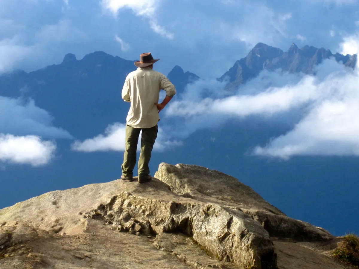 My son overlooking Macchu Picchu mountain in Peru. He appears "On top of the world". It was a once in a life time trip my son to a mystic site.