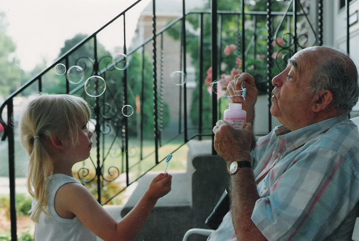 On a lazy summer day, "pop-pop" gives his granddaughter a lesson on blowing bubbles.