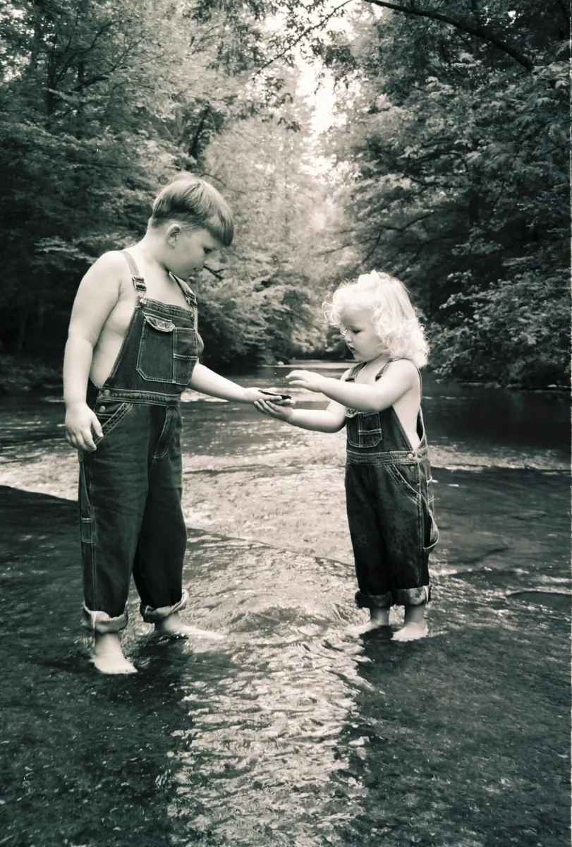 I took my kids down to the creek below our house in Alabama for some photos. It is so beautiful there. The water flows over the road and the lighting is just perfect under the shade of the trees. This picture was my favorite because it wasn't posed. My son picked up a "cool" rock and his sister said, "Let me see!".