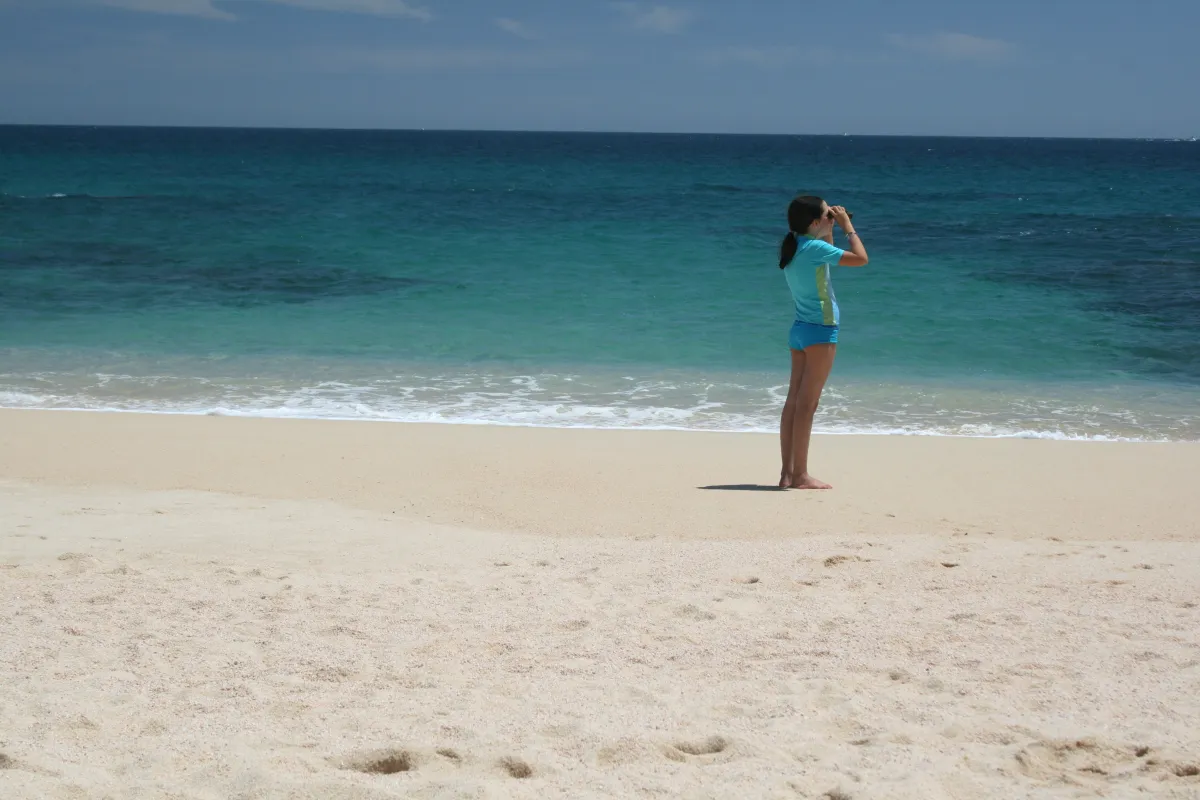 Picture was taken on a beach in Cabo San Lucas, Mexico. Looking through binoculars for the very first time and fascinated by what she could see