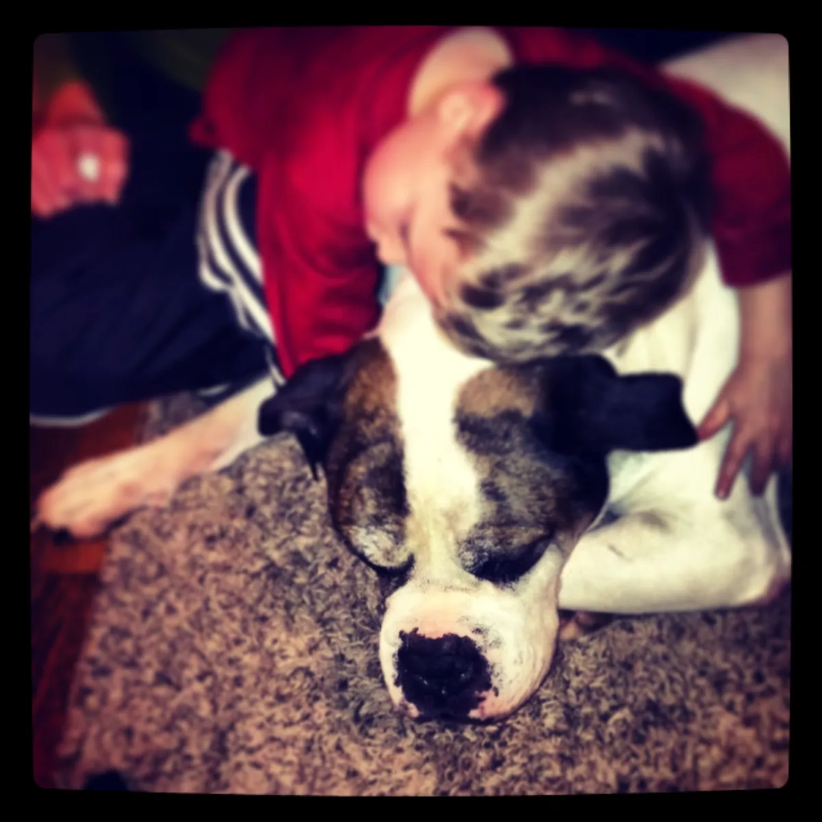 This is before we had to put down our 13yo Old English Bulldog named Dumpster. This is my 3yo Luca, saying goodbye.