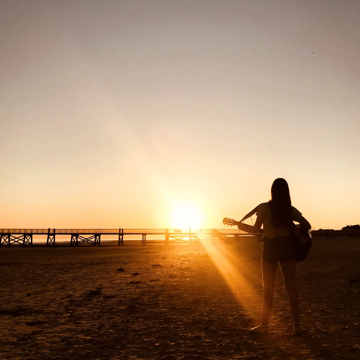 Picnic evening by the beach my daughter, Montaine was watching the sunset with his guitar