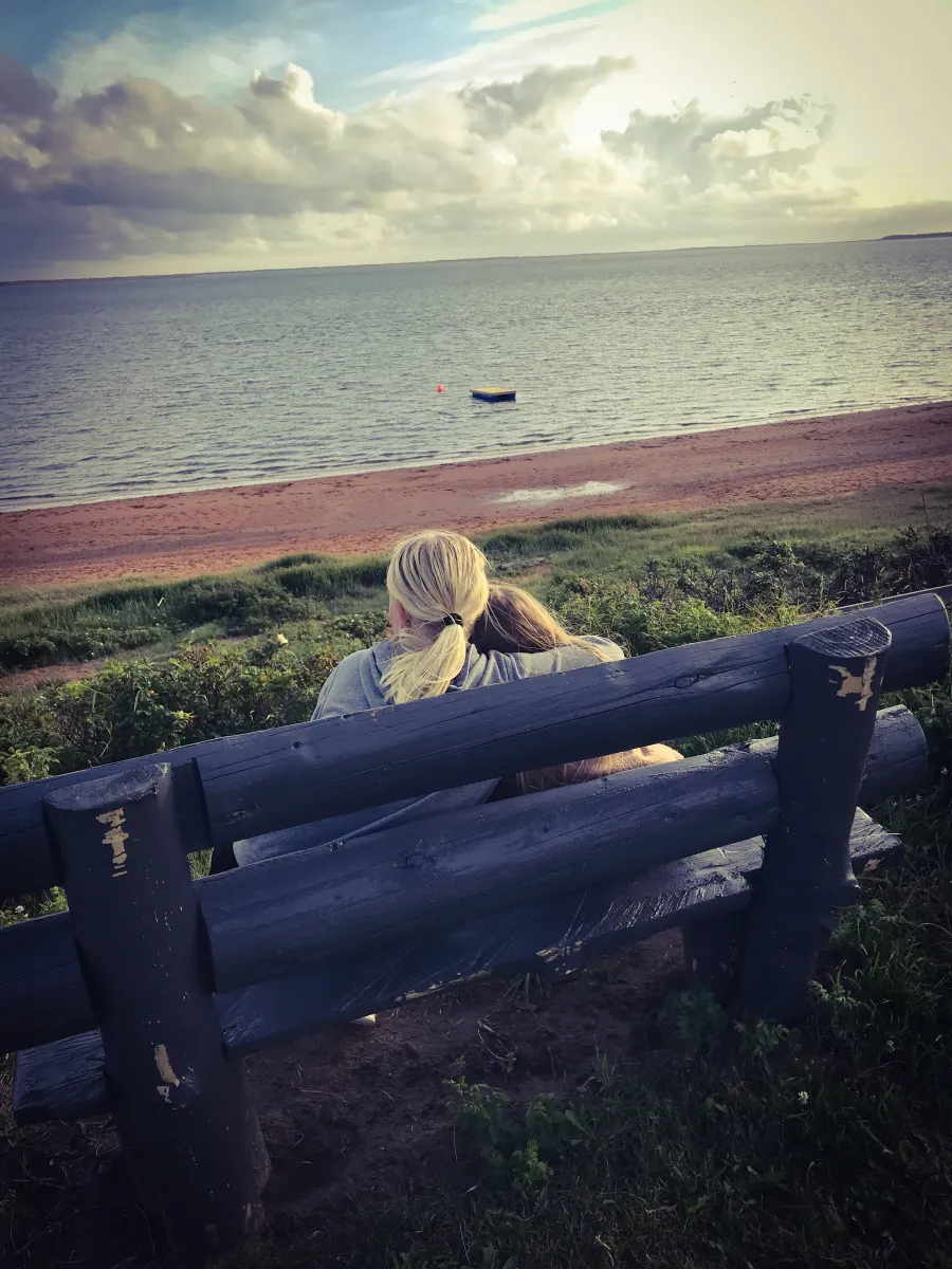 Two visiting workers near the Baltic sea, found a place with a beautiful view for a heartfelt conversation.