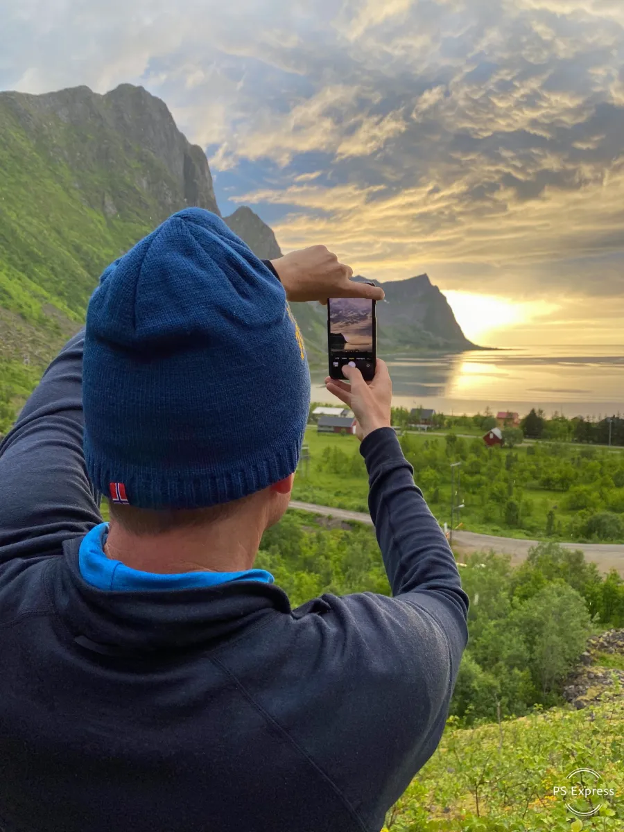 My friend Thomas and I had just started our road trip on the island Senja in northern Norway, when this crazy evening light of a summer polar night started glowing. Thomas was going berserk with his mobile camera, and I just had to capture him capturing this Kodak Moment.