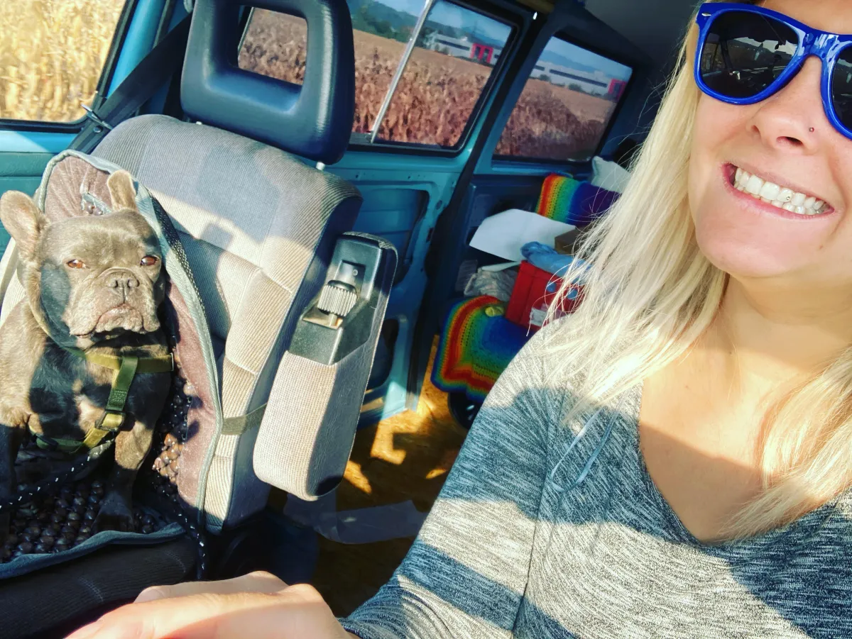 I was outside with my lovely dog and my vw Bus.