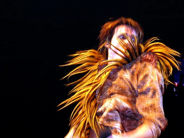 This photo was taken during an amateur singers concert in Sarajevo, Bosnia and Herzegovina -- and depicts a performance by one of the winners. I like it because of the high level of movement captured, while on the other hand, focus captures interesting elements of clothes. Somehow it gives emphasis to the pure energy of performer.