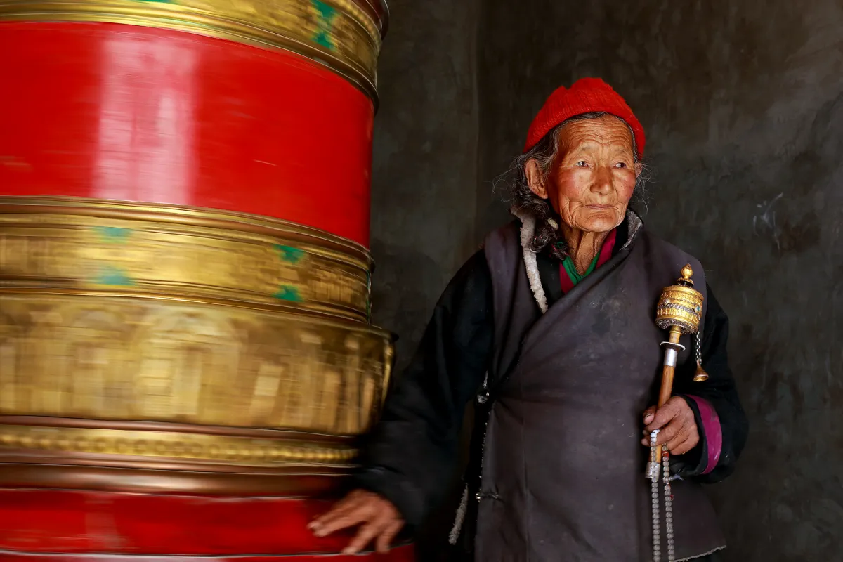 The image captures two types of prayer wheels, each containing the words "Om Mani Padme Hum". It is said that anyone who recites the six syllables while turning the dharma wheel at the same time is equal in fortune to the Thousand Buddhas. While soliciting for some divine help, this old Ladakhi lady was eager to pose for a photograph in exchange for some money. In the cold high altitudes of Ladakh, this could perhaps have been her only source of survival in reality.