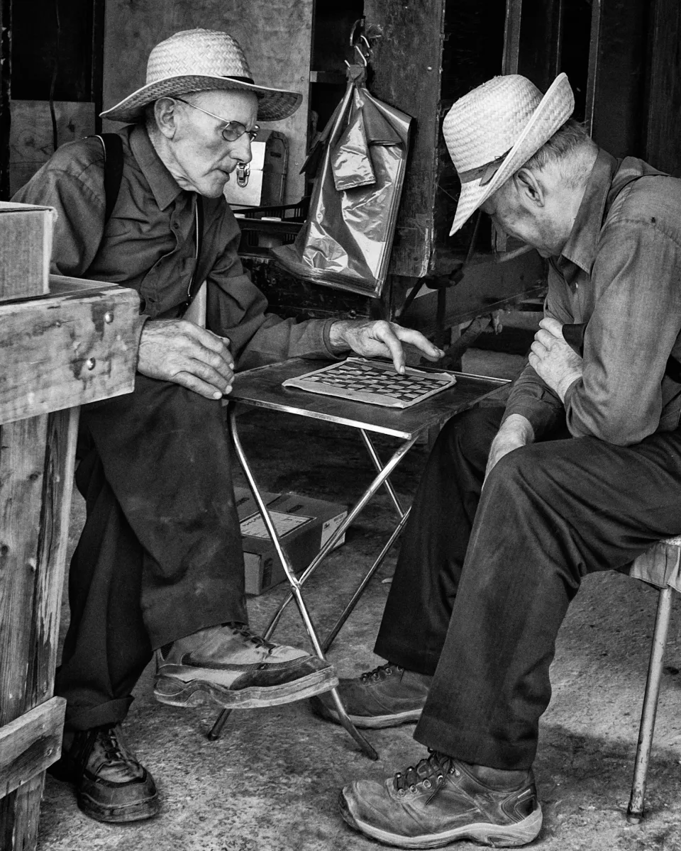 It was a slow day at sales at a farmers market in St. Jacobs, ON, Canada. To pass the time two farmers were playing checkers in a most frugal way.