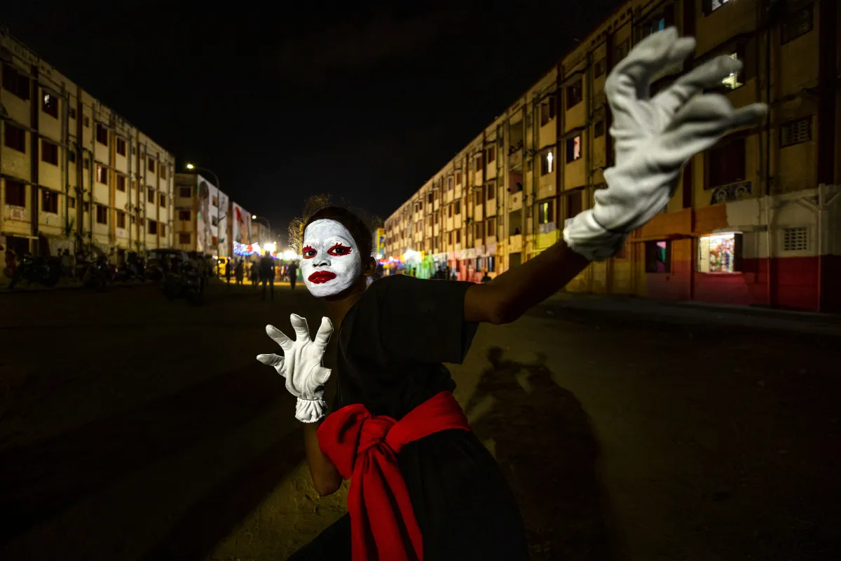 Some large colourful graffiti on the walls of a housing society in Chennai by St+rt India Foundation had made it a sort of a neighbourhood attraction. So the community arranged for a night of entertainment at this venue to celebrate the new art work and bring some cheer to its residents. This is where I spotted this girl representing a troupe of theatrical magicians all ready to perform her act. It felt like her enthusiasm had brought a little magic to the already exciting evening!